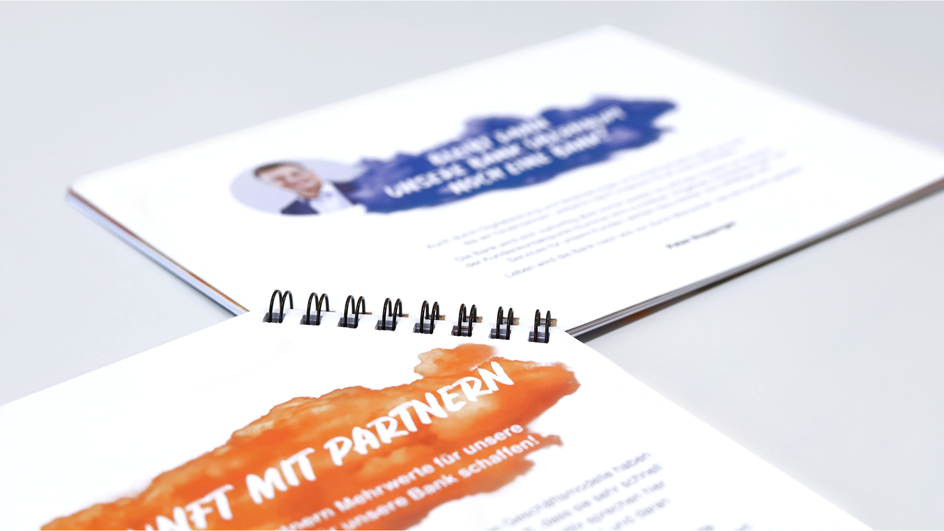 Den Blick in die andere Richtung lenken – dazu zwingt der Wire-O-Block im DIN A5-Format, den die FRIENDS als Präsentations-Tool für die Sparda-Bank Augsburg entwickelt haben: Die Broschüre mit den abgerundeten Ecken ist von hinten her zu lesen. Beim Aufklappen über die schräge Kante sind wichtige Statements rechts oben neben dem Fließtext positioniert – eine Anordnung, die dem Lese- und Blickverhalten des Betrachters folgt.