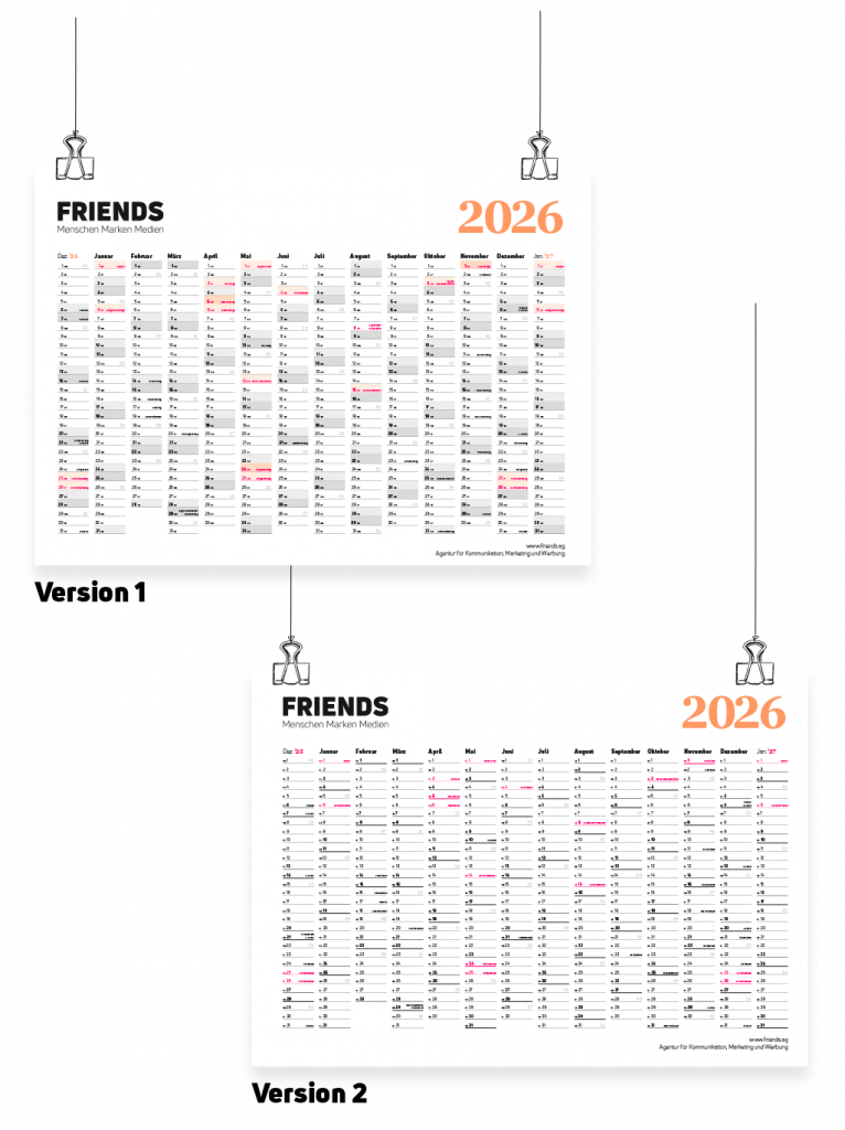 Noch ist es nicht zu spät an das neue Jahr zu denken, schnappen Sie sich jetzt die letzten Kalender! Der großformatige FRIENDS Wandkalender 2026 hilft beim Planen und verschafft den Überblick – so haben Sie Ihre Projekte das ganze Jahr über sicher im Griff. Wählen Sie aus 2 Versionen Ihren Lieblingskalender!