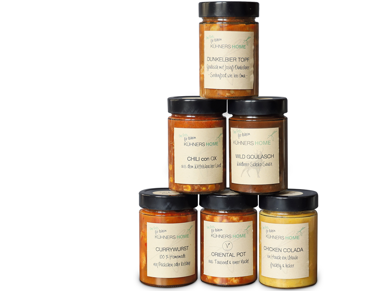 Fertig-Eintöpfe sind in der Regel nicht unbedingt ein kulinarisches Highlight. Was bei den Profi-Köchen von Kühners Landhaus in den Topf oder besser ins Glas kommt, hat damit allerdings nicht viel zu tun. Geschmorte Rinderschulter nach altem Familienrezept oder ein regionales Chili con Ox, Curry-Wurst mit Andreas Kühners Lieblingssauce oder der vegane Oriental Pot: Das ist regionale, hochwertige Küche für zu Hause oder im Büro und zwar ohne Konservierungsstoffe oder Geschmacksverstärker.