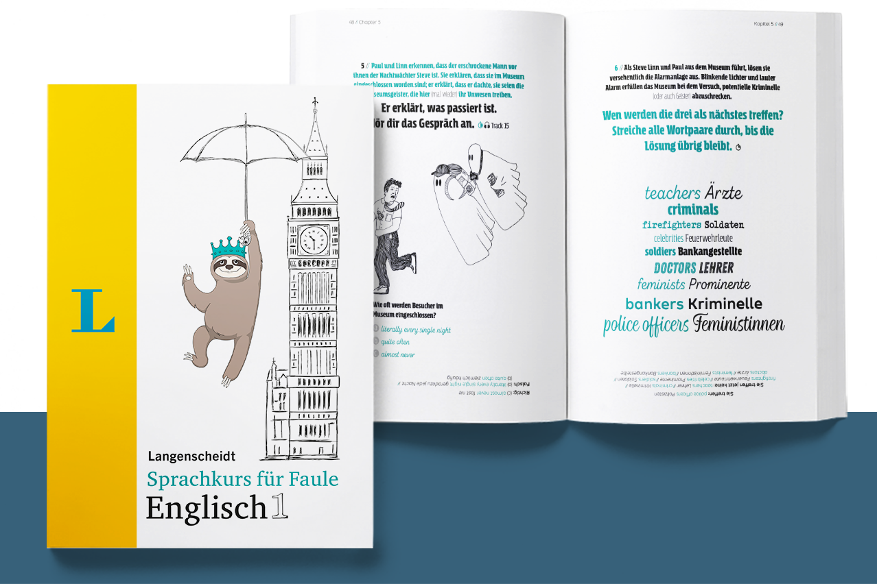 Die Entscheidung für ein Buch hängt zu einem großen Teil vom Cover ab. Macht das Titelbild Lust, ins Buch reinzuschauen, ist viel gewonnen. Beim Sprachkurs für Faule ist das definitiv so: Man kann sich gar nicht sattsehen an Faultier Oskar, der mit dem Regenschirm vor dem Big Ben in London landet, in Pisa vom Ast baumelnd Spaghetti vor dem Schiefen Turm isst und sich in Barcelona in der Hängematte vor der Sagrada Família sonnt. Auch wie es in Paris an der Laterne vor dem Eiffelturm und in Berlin an der Ampel vor dem Brandenburger Tor hängt, ist nicht nur niedlich, sondern macht neugierig auf den Buchinhalt. Das süße Faultier Oskar auf den coolen Umschlagseiten stammt von den FRIENDS – die Unit Grafikdesign hat sich künstlerisch ausgetobt und nicht nur die bezaubernden Buchtitel der Reihe „Sprachkurs für Faule“ unseres Kunden Langenscheidt designt und kreiiert, sondern auch Layout und Satz aller fünf Ausgaben der Taschenbuchreihe in den Sprachen Englisch, Spanisch, Französisch, Italienisch und Deutsch übernommen.